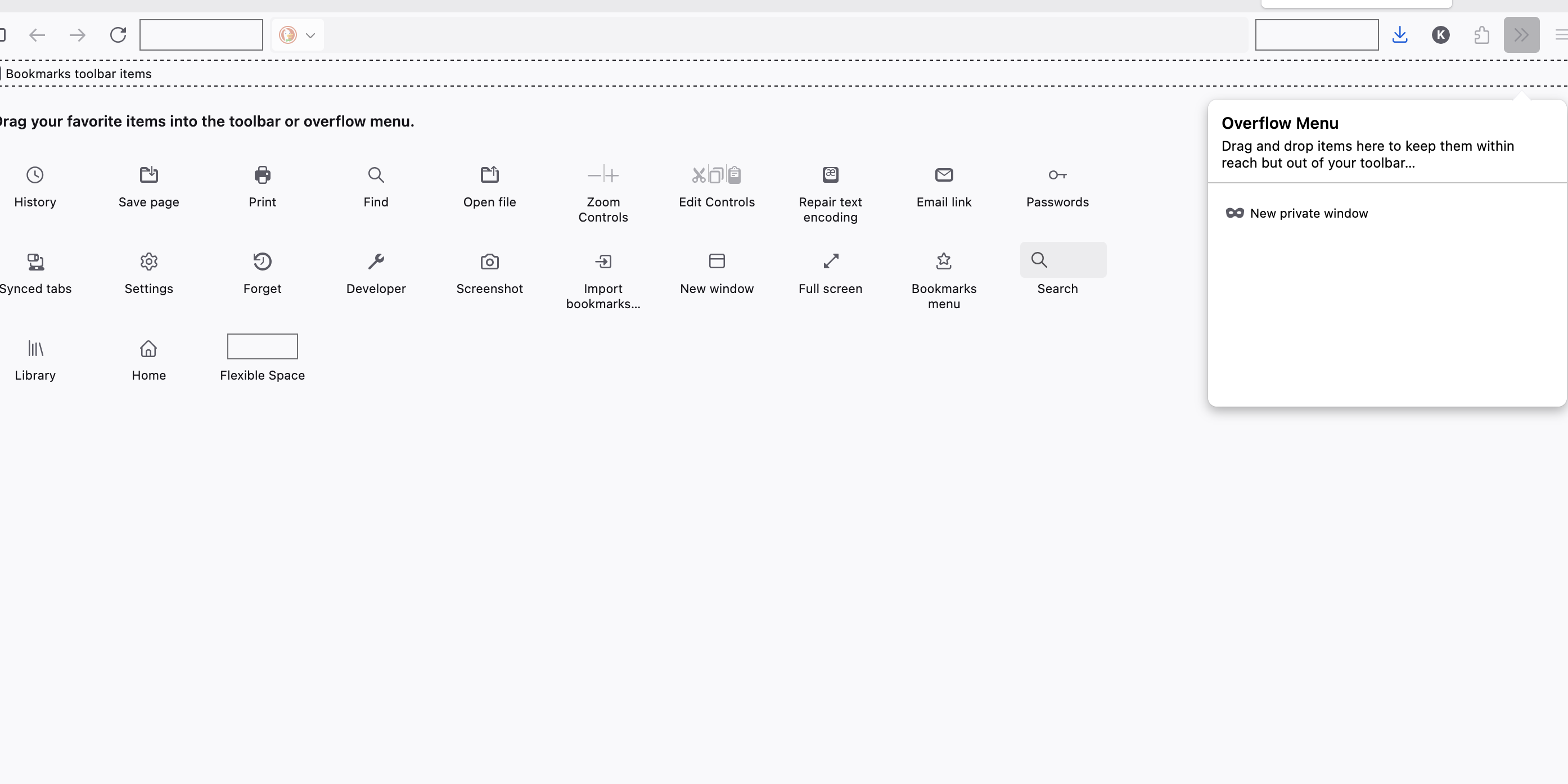 I'm having trouble getting my extensions to show up in the toolbar. Every help article has you start with the puzzle piece icon for extensions, but this is missing from my toolbar. I've tried right clicking to 'customize toolbar' and I am able to drag a extensions icon around, but it's grayed out and doesn't appear when I apply the new settings. This is making my browser virtually unusable since I can't access my password manager, etc.