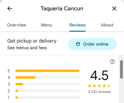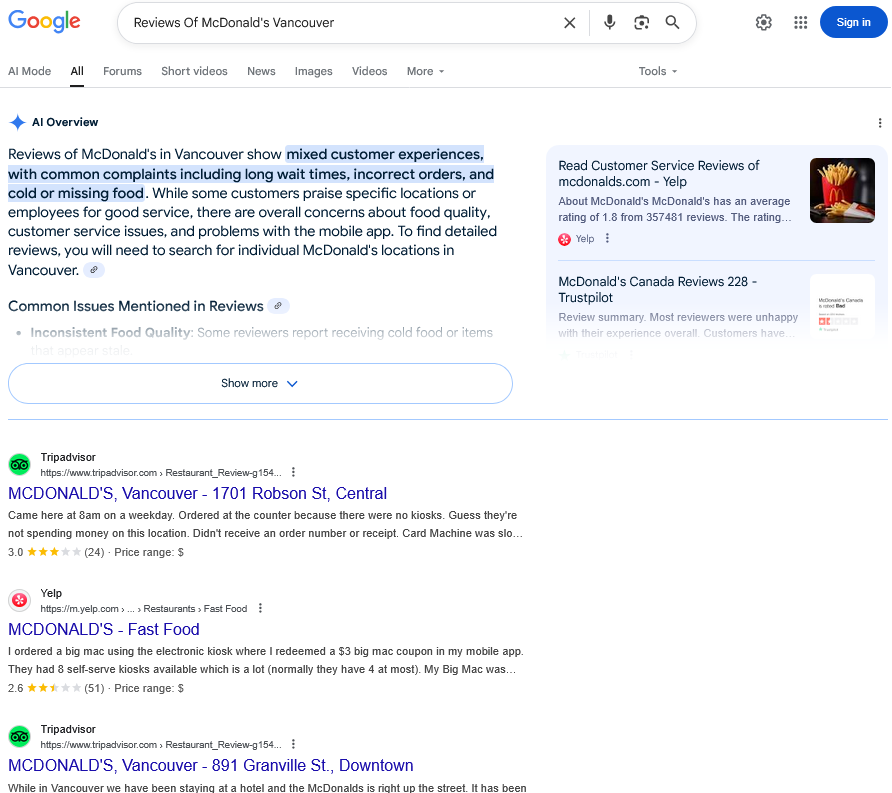 Example: A Google Search of 'Reviews Of McDonalds Vancouver,' displays Google Reviews, with the blue link, on the right side.