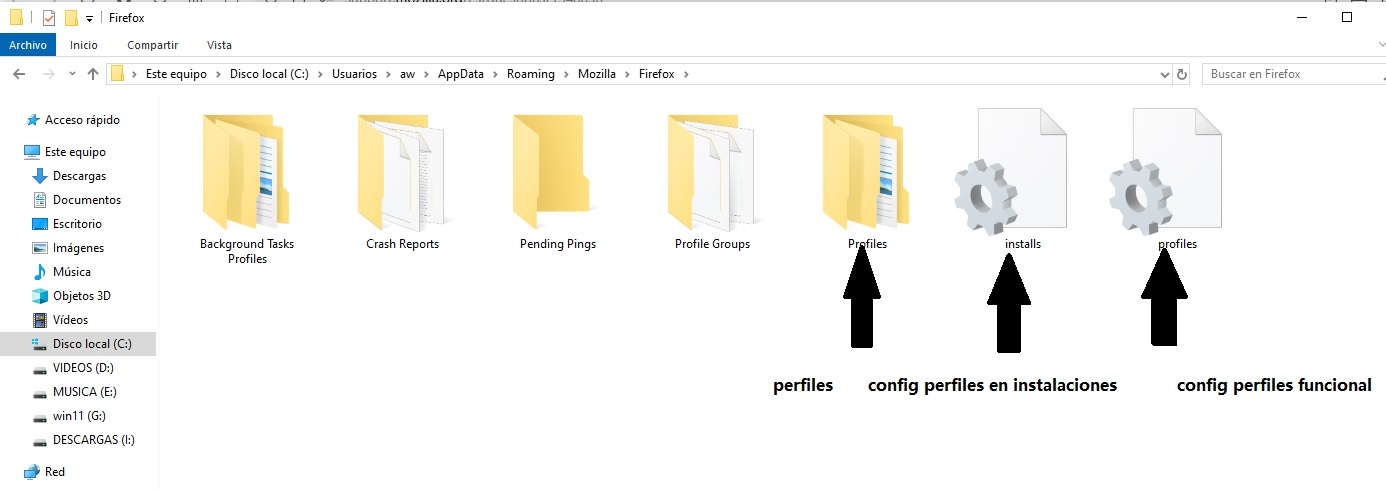 En la carpeta profiles si tienes un perfil antiguo donde te iba bien,instalación nueva con un nombre y perfil nuevo,abre tu perfil antiguo y mueve todo lo que hay dentro a la carpeta del nuevo perfil creado en la nueva instalación.Ahora arranca firefox .También se pueden modificar los archivos de config para indicar al sofware que arranque con un perfil antiguo que sepamos que va bien.Si tienes el perfil bueno restauraras sin problema si no tienes un perfil antiguo de una instalación donde te fuera bien, problema resuelto si no es asi no toca mas que borrar las carpetas y datos que tengas de la instalación de mozilla.Nueva instalación limpia no hay mas. Pero esto es muy viejo yo cada vez que formateaba o cambiaba de pc,lo 1º users\yo\appdata\roaming\mozilla al usb.Pero no llego a entender hoy en dia si es todo automático,te guarda todo sin tocar una tecla y que solo con entrar desde tu Firefox en tu cuenta Firefox y sincronizar desde esa cuenta en minutos tienes todos los datos.Te hablo de que tengo datos de mozilla desde el 2002 a dia de hoy y sin problemas