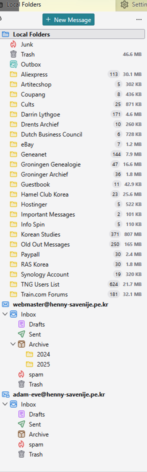 @ Rick, I have both, I have a server at hostinger where the mail is, and I have a server at home, where my genealogy website is and yes, mail.henny-savenije.pe.kr works in Eudora, the confusing part is, that when I click on "fetch mail" in Thunderbird, it seems to log in, and tells me there is no mail on the server (I have set Eudora to leave mail on the server)