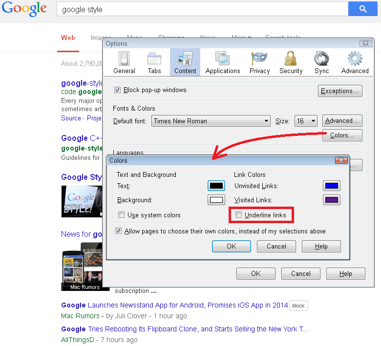 How do I change the results appearance BACK to what it used to be, with each web site title underlined without running over them with the curser.
