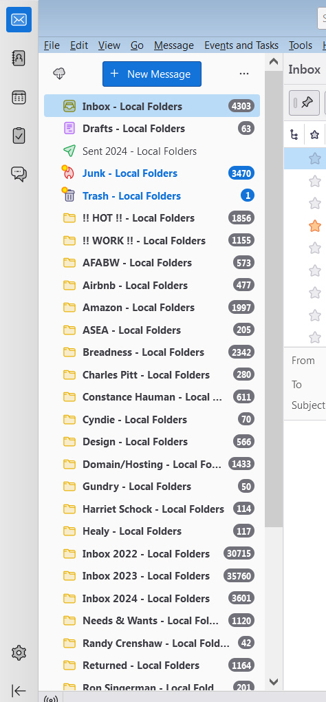 Ever since TB 115 updated on my system, my folder list is now cluttered with " - Local Folders" after every folder in the list. This wasn't like that in TB 102. I could find nowhere in TB how to change this nor could I find any discussion of this topic on line so I've created the topic here. Perhaps you have an answer?