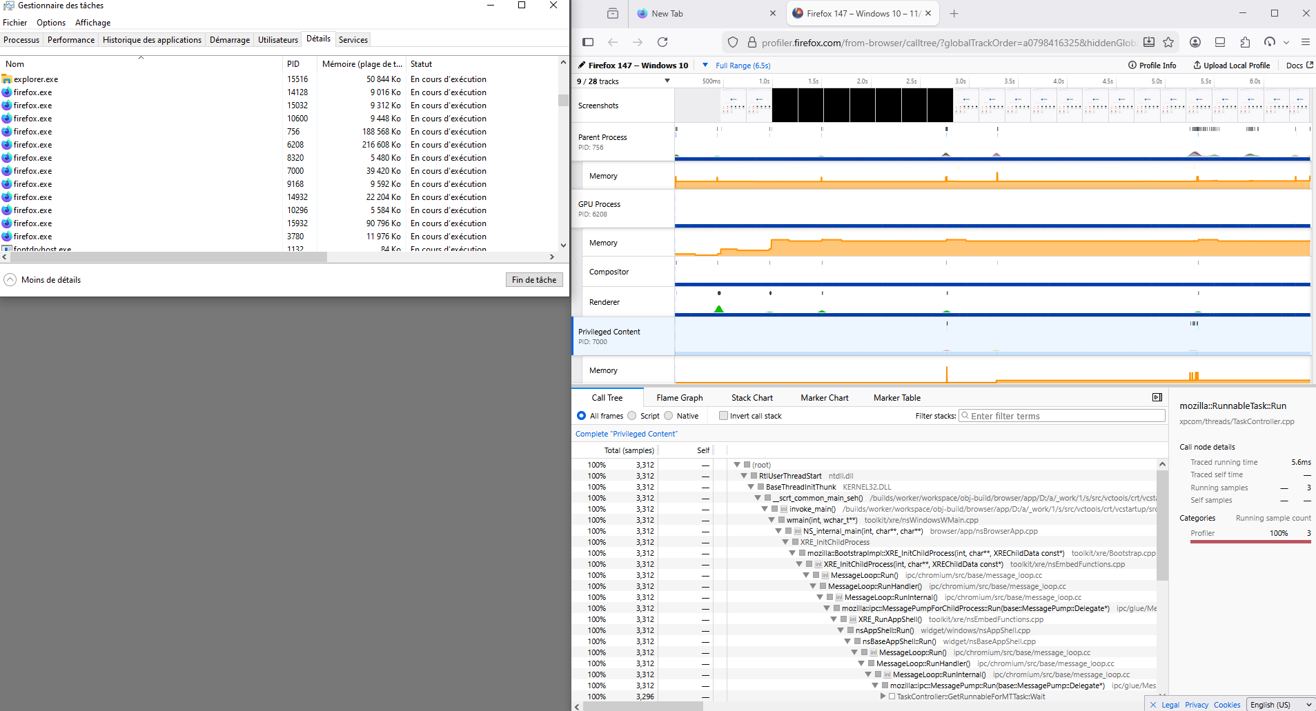 Below, i started Firefox, next, i started, Firefox Profiler https://profiler.firefox.com