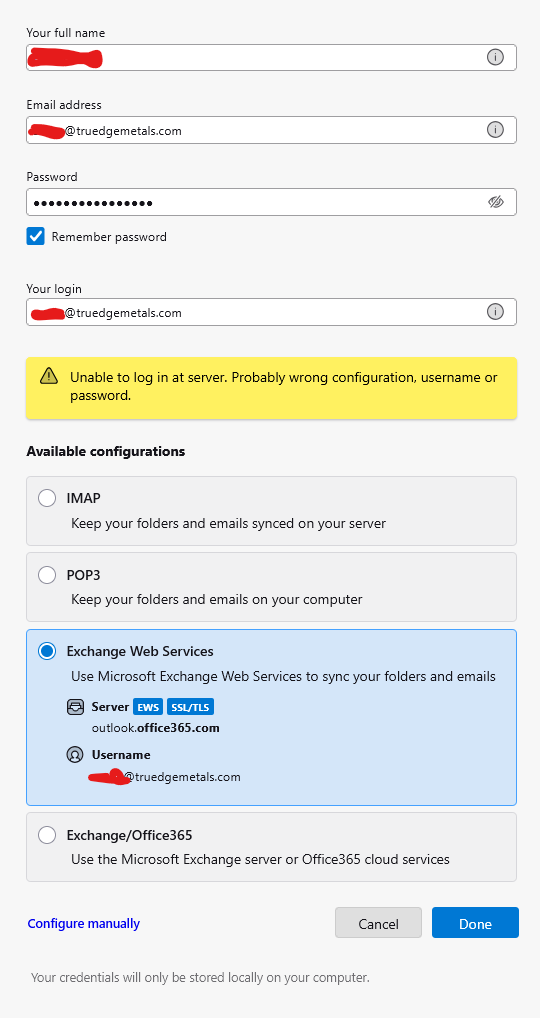 I have a Microsoft Exchange hosted email address with a (mycompanyname.com) domian. I can check this account via Outlook, but I love Thunderbird so much, I want to sign into this new company account too on Thunderbird. I know I need to do it via the Exchange Web Services but I get an 'unable to log in at server' error. See the screen shot attached, is my login field correct? What should the login field be? Willing to try any suggestions please! Thank you,