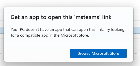 Client emails me a URL that is an invite to his MS Teams meeting. I click on it in Firefox and I get a pop up box that states I don't have an App and wants to direct me to the MS Store. I have a MS365 License....