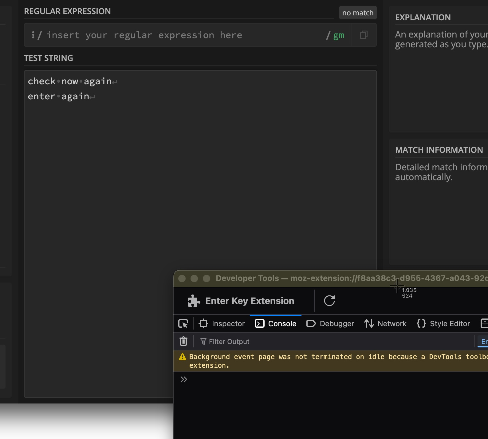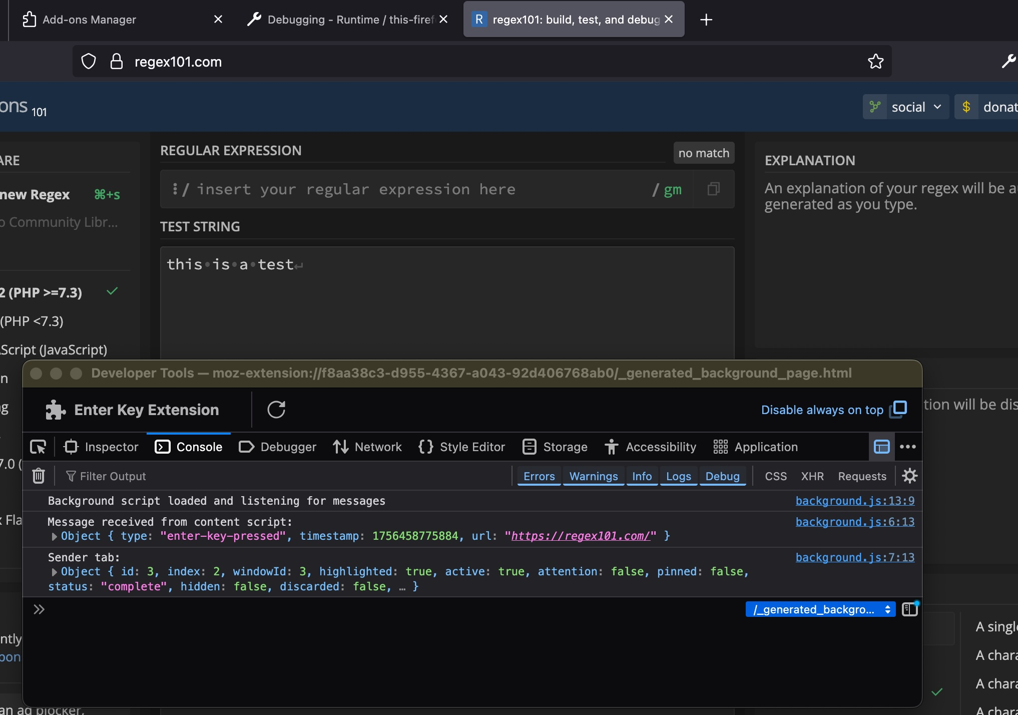 // Check if the pressed key is ENTER if (event.key === 'Enter') { // Send message to background script chrome.runtime.sendMessage({ type: 'enter-key-pressed', timestamp: Date.now(), url: window.location.href }); }
