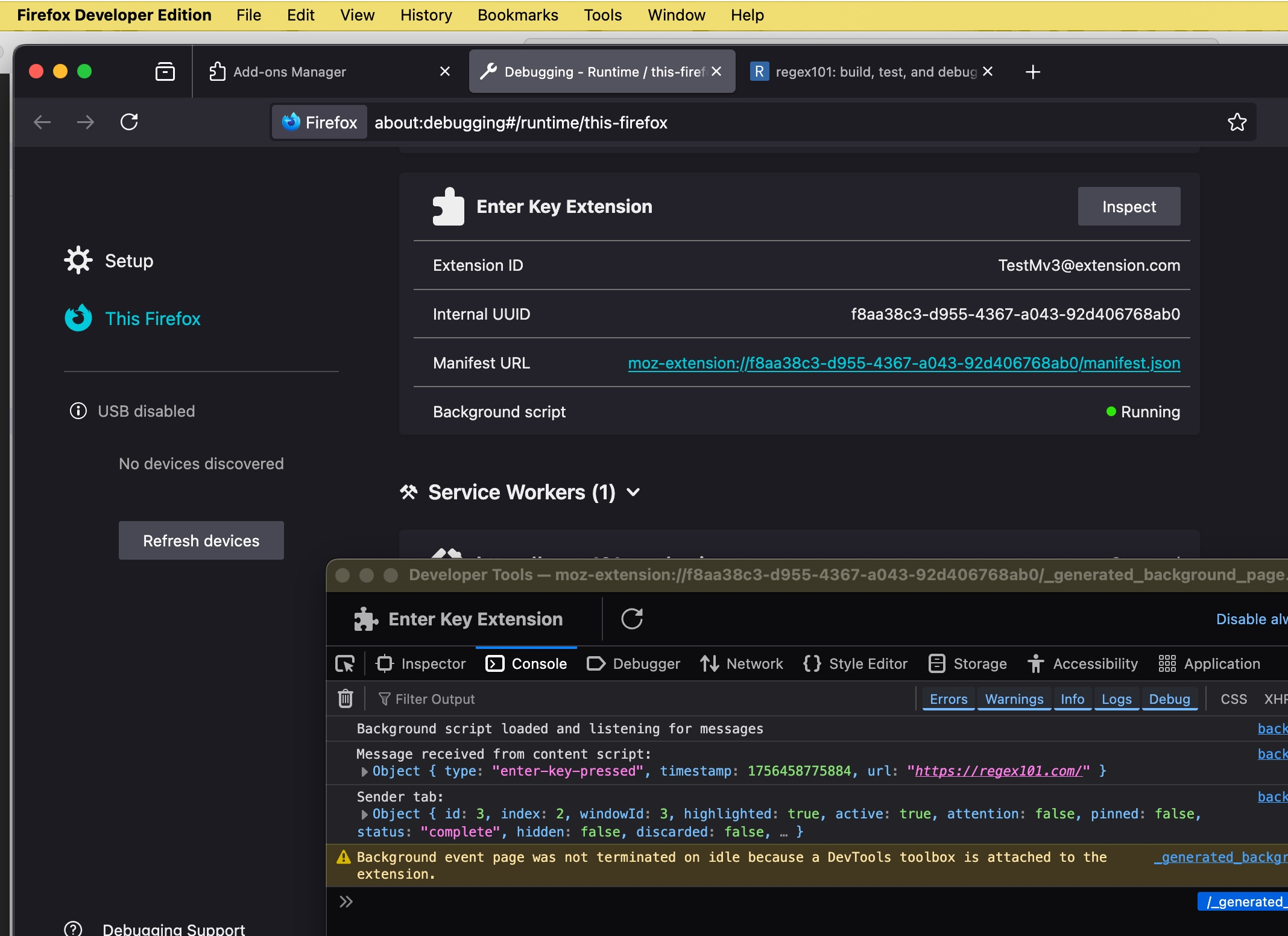 console.log('Background script loaded and listening for messages'); ``` PFA: Screenshots for the tests. In first 2 SS, the extension is observed to be forced-installed and also the console logs are visible. In last 2 SS the optional permission "Access your data for all websites" is turned off and because of which the console logs are not observed and the extension also do not communicate with the background.