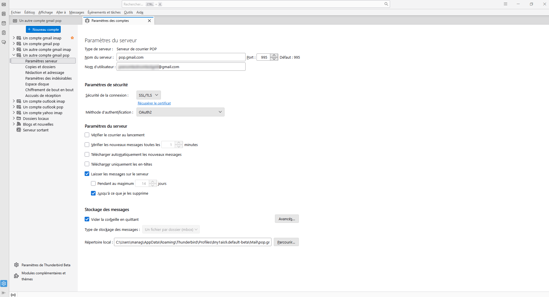 account4: INCOMING: account4, , (pop3) pop.gmail.com:995, SSL, passwordCleartext OUTGOING: , smtp.gmail.com:465, SSL, OAuth2, true