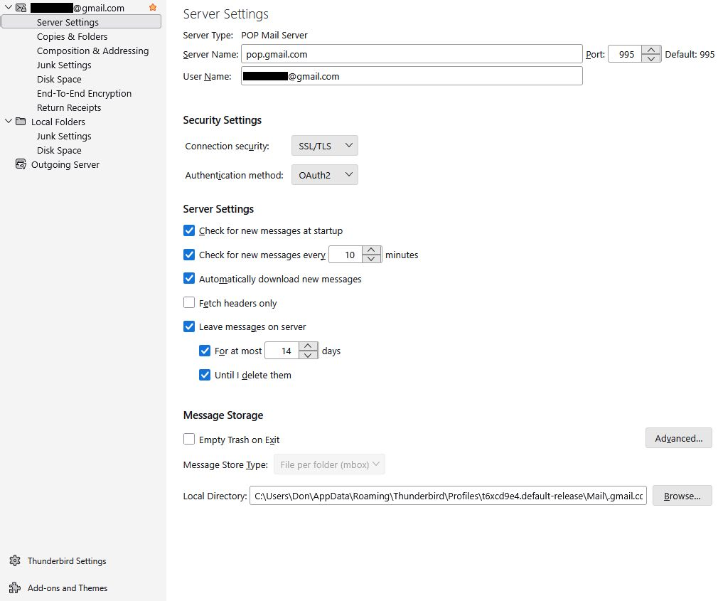 Every time Thunderbird tries to get my mail, the screen pops up asking me "Sign in" to continue. When I tap the "Next" button, I get the "Google 400" error which is no help at all. I've attached the server settings that I have now.
