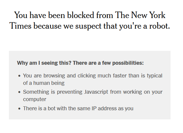 Why can I suddenly NOT get a link to New York Times articles to open since the last update. It accuses me of being a bot!