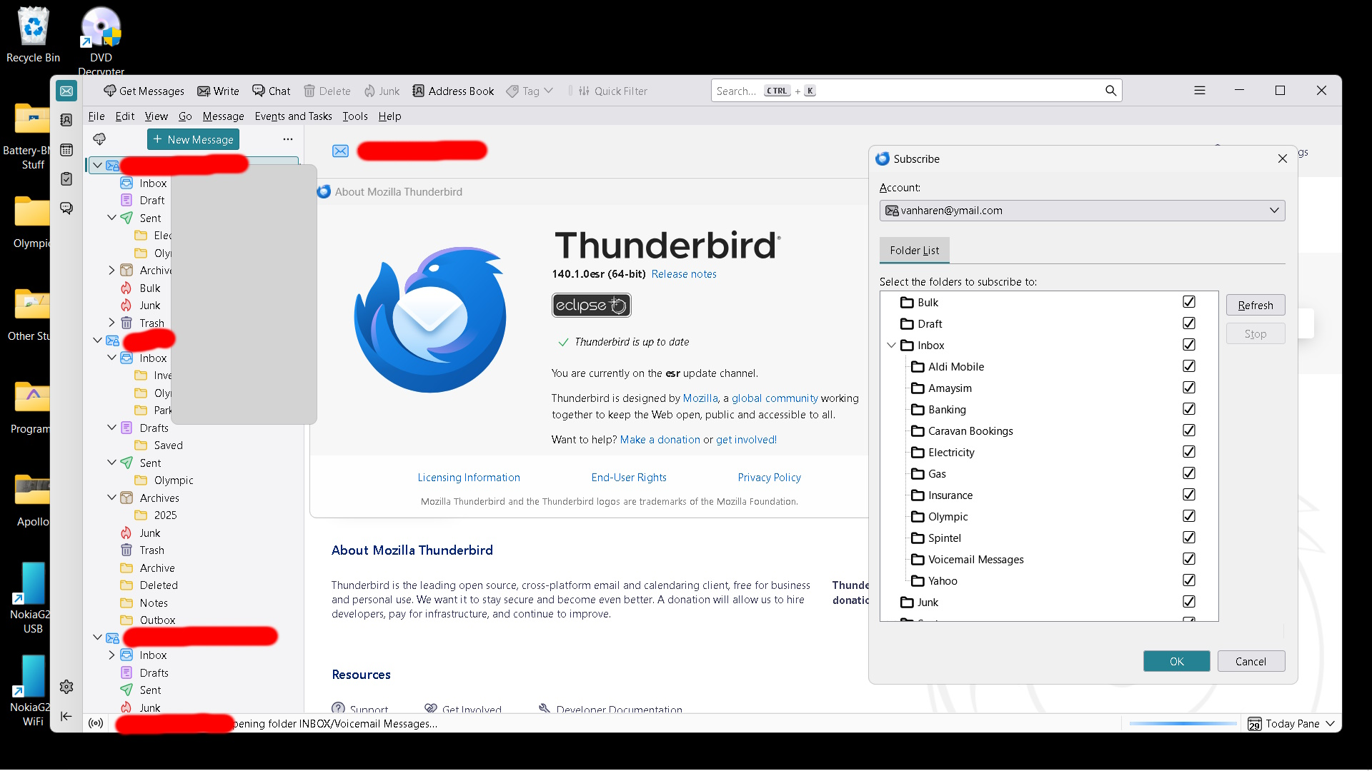 I updated to 140 on one windows laptop, since then the Inbox sub-folders of a Ymail account disappear. The weird thing was that on start-up, some were displayed, but disappear one-by-one. Another laptop which was running 120 still had the sub-folders intact. I updated that to 140, and when TB restarted, the sub-folders were displayed, then slowly disappeared, one-by-one. It is only the Ymail account that is effected, we have a couple of Outlook accounts that display their Inbox sub-folders. I have selected "Subscribe", all folders are selected. I've unticked the sub-folders thinking that maybe it would allow me to re-select them, but on a re-start they are still shown as selected.