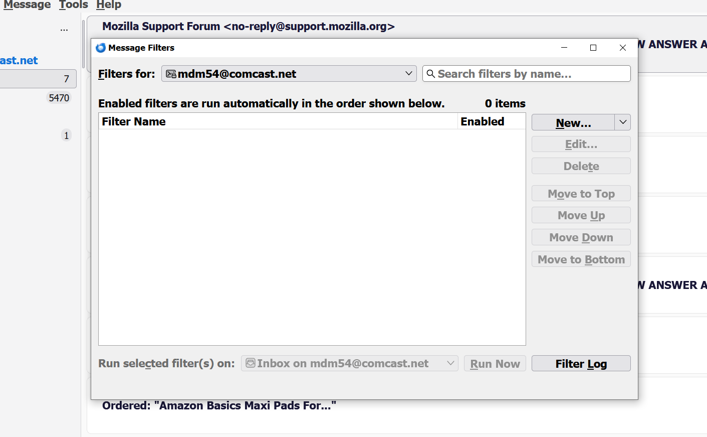 Hello I have asked this before but i did not get an answer i could use i did get an answer but it did not work. So i am asking again. I can run Thunderbird for like a month and then all of a sudden all inbox mail goes to trash folder abut not with the name of the sender with my name as the sender I have reinstalled several times i have changed my security gone from 64 it to 32 bit removed some add ons or extensions. Now it is run from Comcast email and that is correct as far as i know. Not sure i have it filtered correctly i am stumped please help me here . every time i d reinstall i need to put back manually all my contacts and that takes forever . Please i have even disabled Norton antivirus for 1 hour and it was doing this with windows explorer as well so please I know i asked this before but nothing worked. I hate to stop using Thunderbird but if this keeps happening i may need to. the only extensions i have in Thunderbird enabled are emojis, config button, restart, and ublblock. Not sure how to get to filters and change any thing. Thanks Please i need help thanks upset Thunderbird user