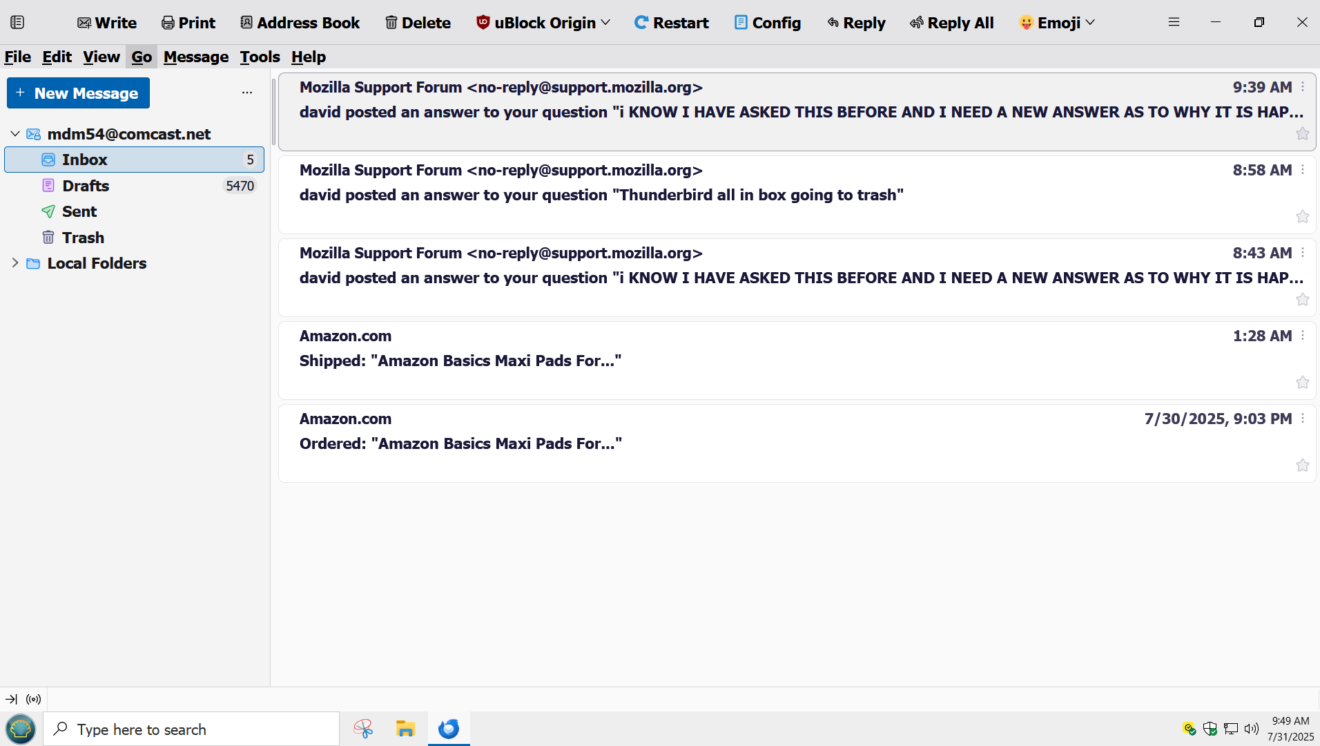 thank you i will try it but you see when it goes to trash and drafts i reinstall and have to print it because i need to reinstall and it only last for a few weeks and it messes up and i need to do it all over again to the point where i will have to not use thunderbird again and just use Comcast mail