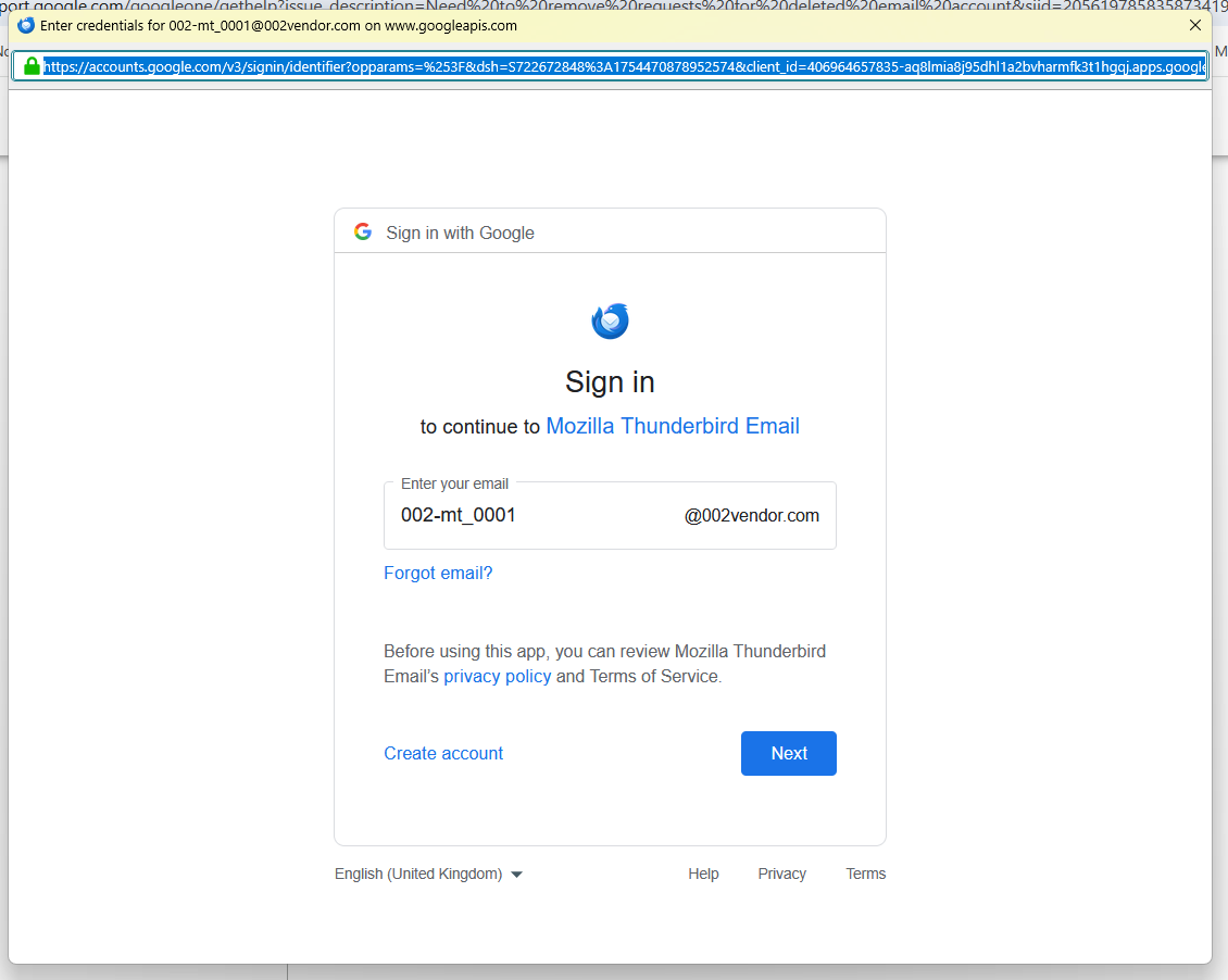 I use Thunderbird to consolidate all my email addresses and it keeps asking me to enter credentials for a disabled account. I have removed the account from Thunderbird, as well as all the related contacts, but I still get a Google window to enter my credentials here: