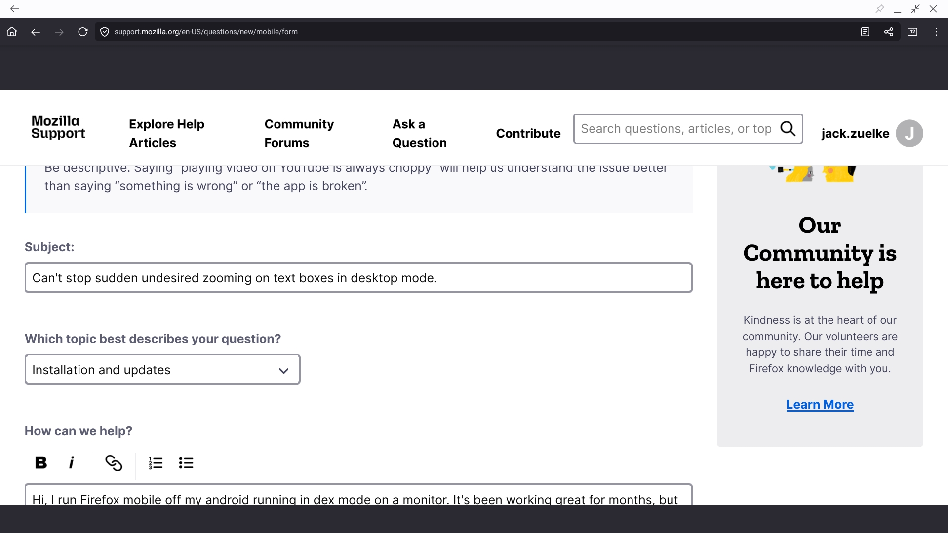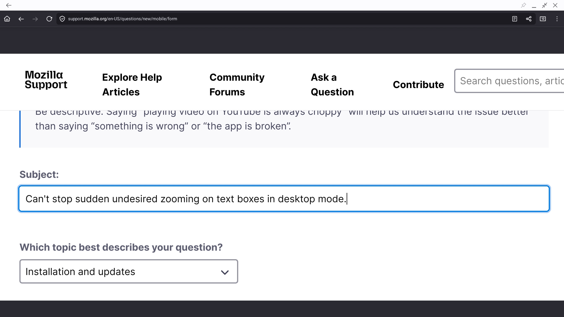 Hi, I run Firefox mobile off my android running in dex mode on a monitor. It's been working great for months, but seemingly right after update 142.0 I can't get it to stop zooming in and scrolling to every text field I click on. It wouldn't do any text field focusing before, and it would behave like a normal desktop browser.