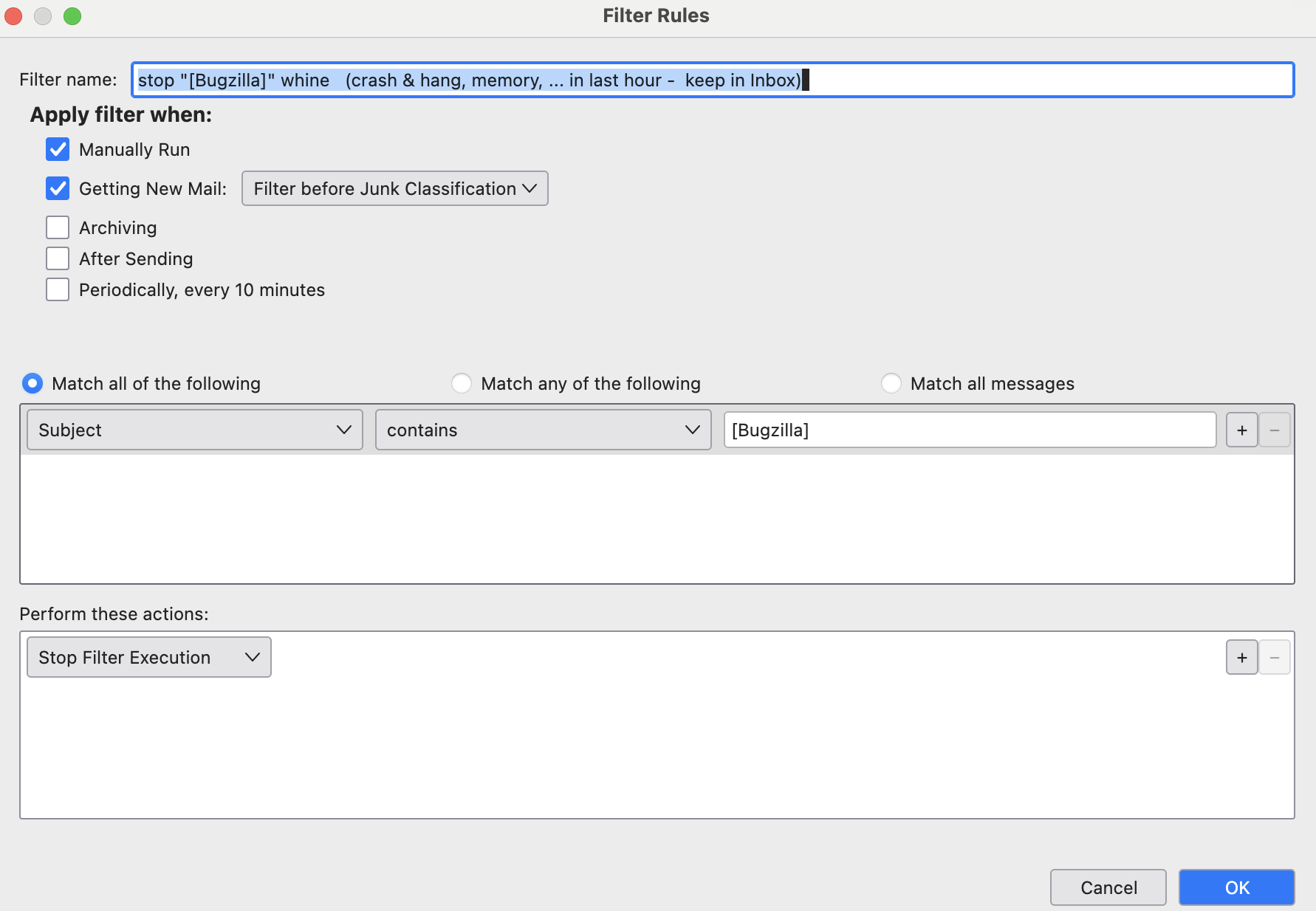 "stop filter execution" is at the very bottom of the action list. In the example screen shot, this filter prevents a message that matches from hitting any more filters, and effectively keeps the message in the Inbox. If this action was not taken, then the message might hit a lower filter which would move the message to a folder.