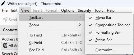 bars with options are set at view>toolbars if not shown, click alt key and then click view>toolbars and set. repeat this process also after clicking 'new message' as the options are different there.