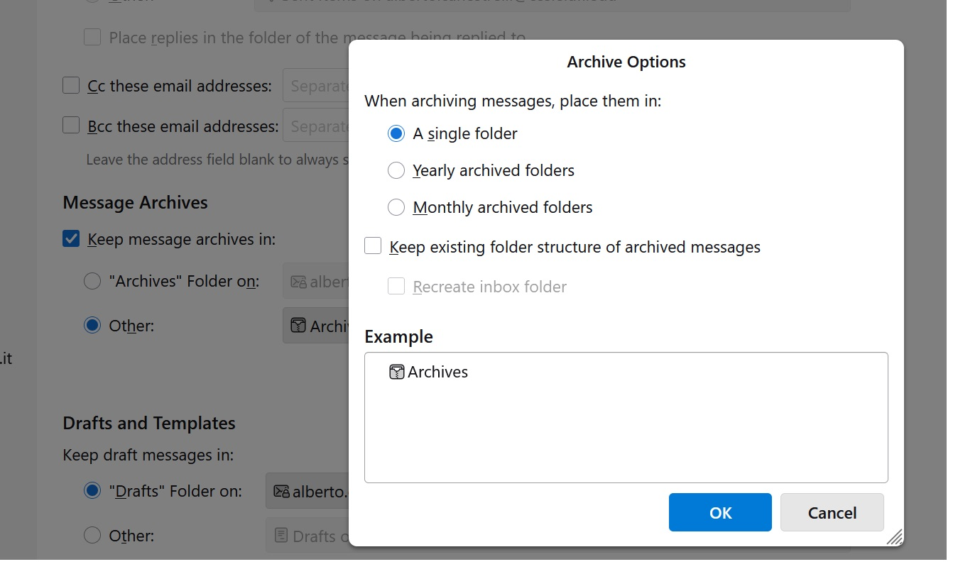 My file named "Archive" (no extension) in the ImapMail\outlook.office365.com\ folder is now 3 GB. I like all my inbox email progressively be archived in a single archive folder, searches are easier (in do not need to tick off "search subfolders" when I do Edit -> Find -> Search and I select the Archive folder. But I was wondering: does this affect speed (speed at which chunk of emails are archived at once, search speed etc) ? Should I archive by year? If it makes a big difference, how do I get thunderbird to get everything moved in years folder? If I select "yearly archived folder" in the attached screenshot, is it gonna start archiving by year from now on but it leaves the old files in a single folder, or does it creates also the yearly older folders and split all the past emails on those folders?