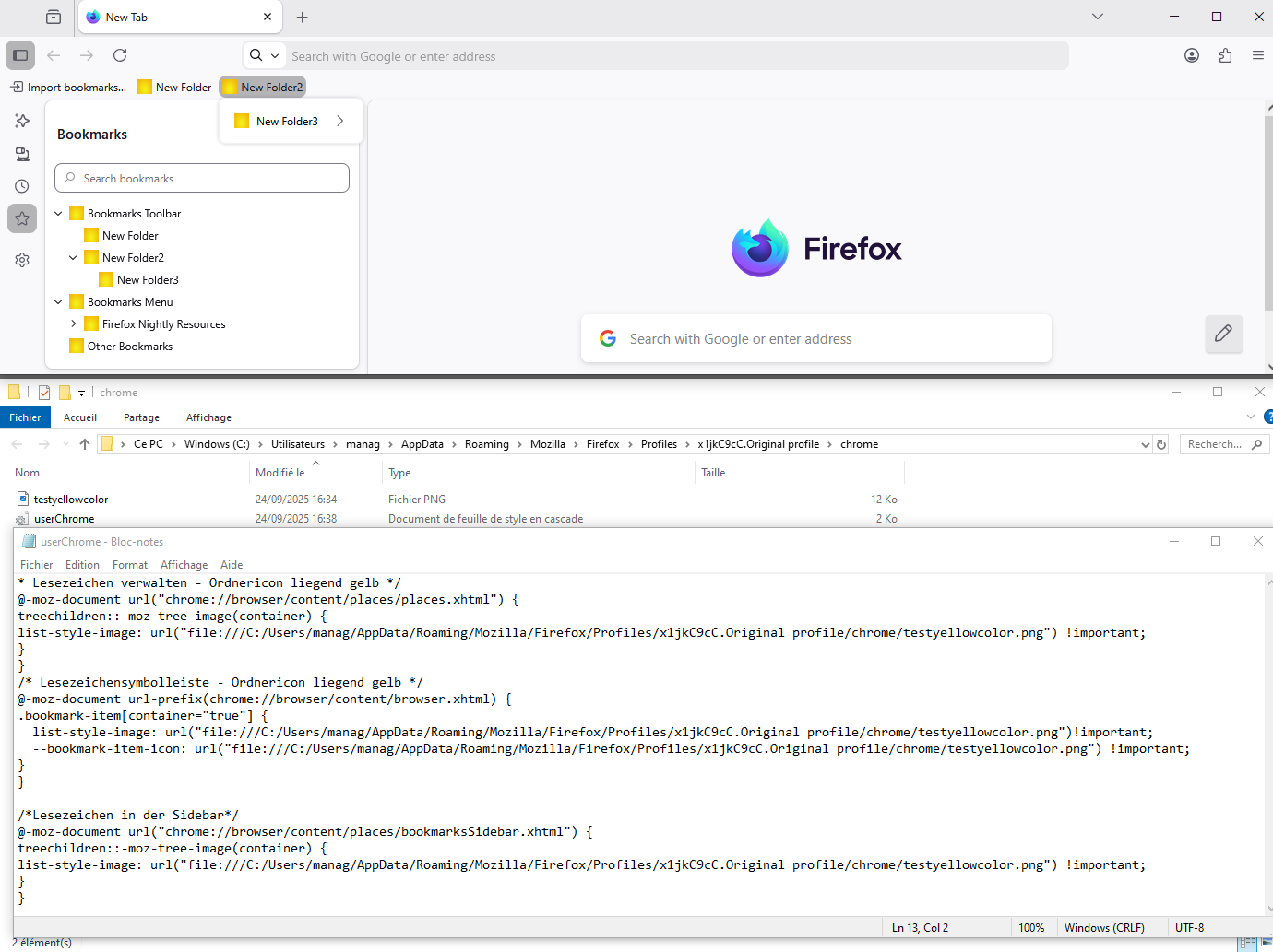 Yet again Mozilla have decided that yellow folder icons are not needed and have amended the code so user chrome files no longer work. Is there a new way to return the folder icons to yellow or are we stuck with the black icons with a white frame?