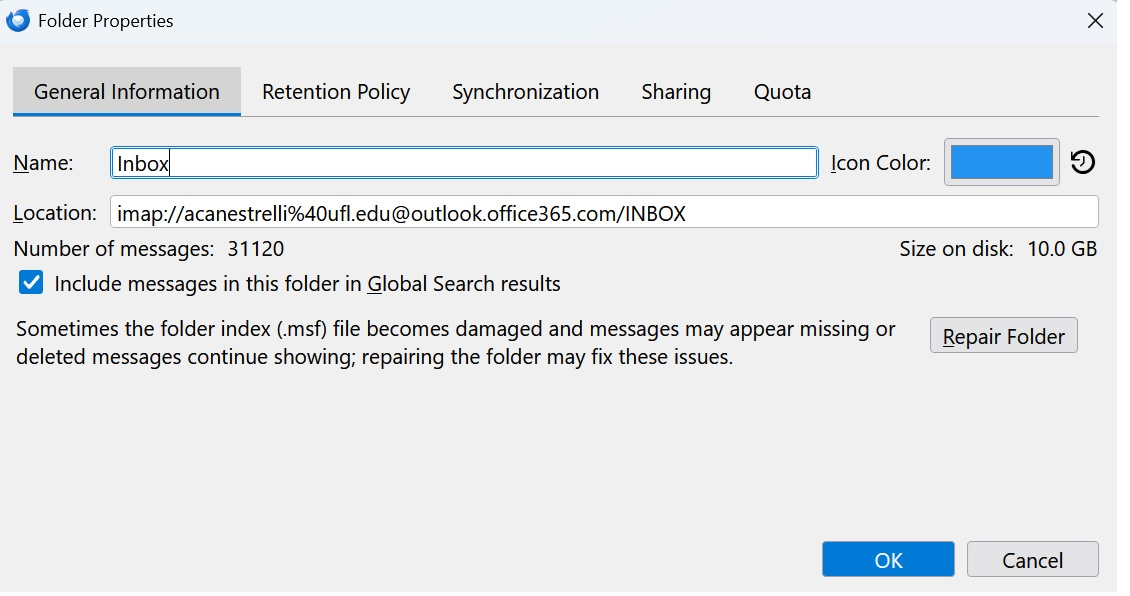 Is the same thing if I delete .msf files for a given folder or I click "repair folder" under folder properties (see screenshot)? If different, which are differences, pros and cons, and which one is suggested. In my particular case, I have Thunderbir in a loop redownloading my Inbox. Closing and opening did not fix.