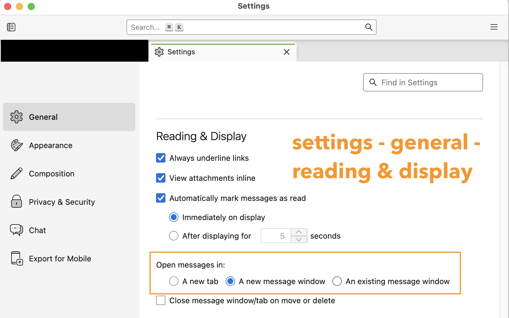 - If you want to view a message in its own space, one option is to open it in a new window. Only that message will appear in the window. You can make the window as large as you want. Thunderbird will remember your preferred size and keep using it with other messages.