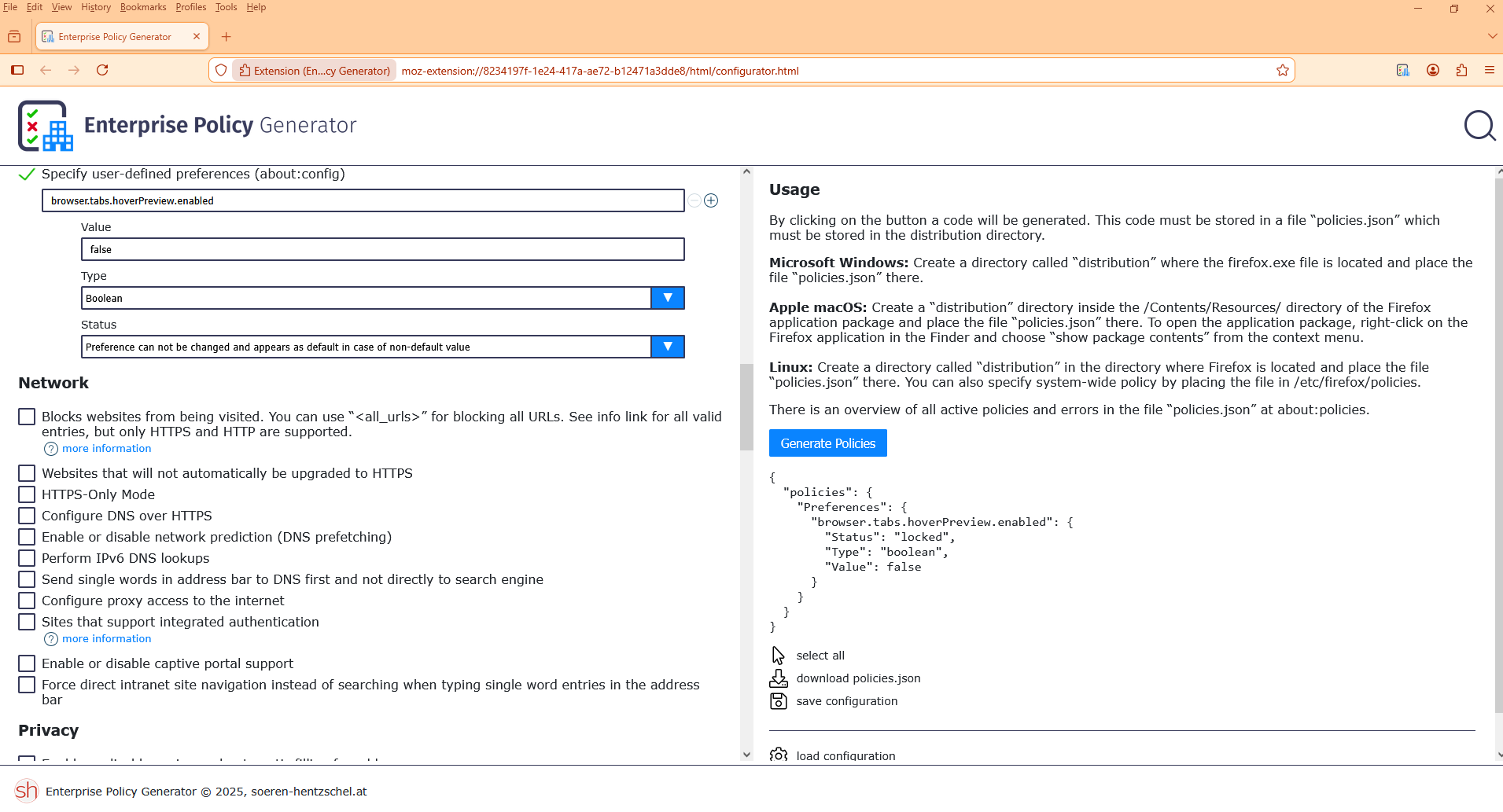 The Enterprise Policy Generator https://addons.mozilla.org/firefox/addon/enterprise-policy-generator helps to create the configuration file.