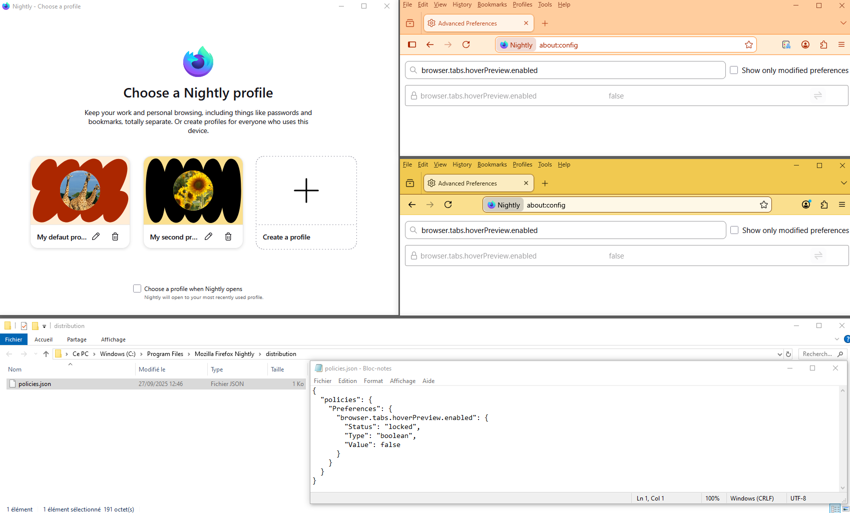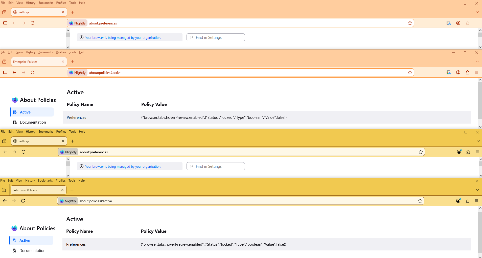 { "policies": { "Preferences": { "browser.tabs.hoverPreview.enabled": { "Status": "locked", "Type": "boolean", "Value": false } } } }
