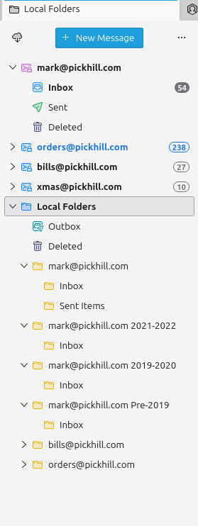 I've recent moved to Linux and Thunderbird from Win/Outlook. I have a singifcant message base that I've successfully migrated to Thunderbird, most in bound email but witha chunck of outbound too. This all appears in Local Folders, with the outbpund stuff in Sent Item sub-folders.