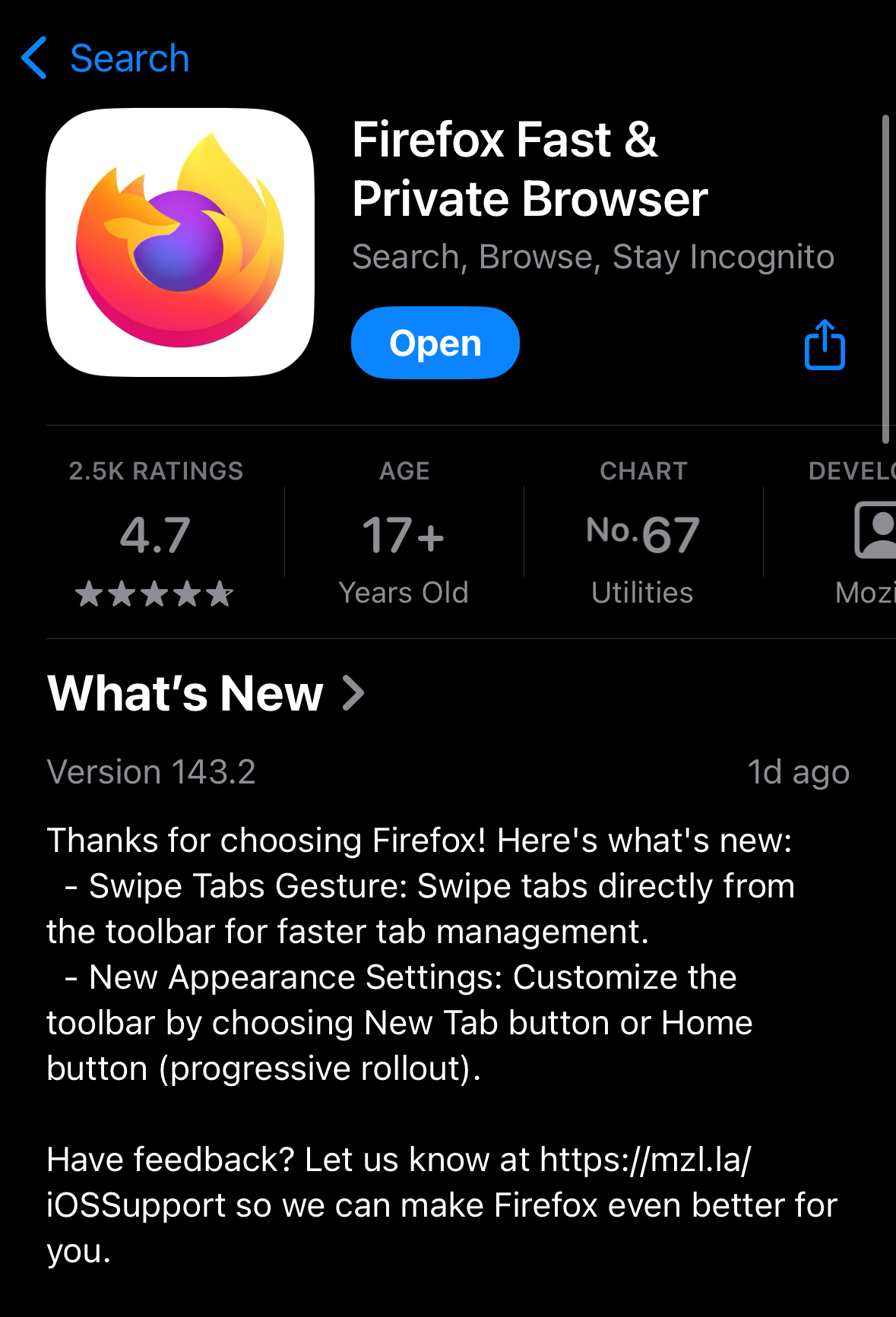 I upgraded to 143.2 on iOS 26.0.1, but I cannot access any swipe tab gestures, which I assume means I can just swipe left and right in address bar to move between tabs.