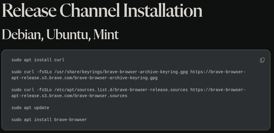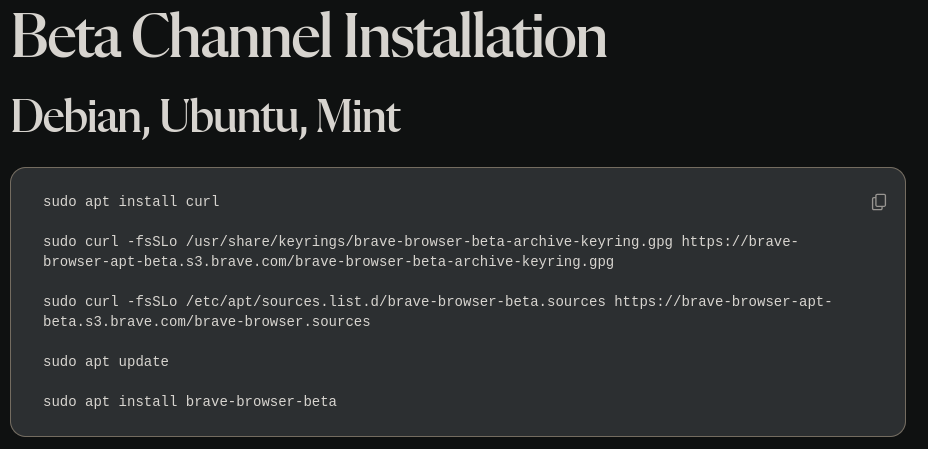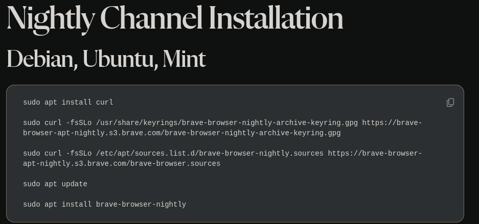 tienen que dejarlo mas ordenado los comando para poder instalarlo tanto nightly,deveolper,beta,y estable para el usuario para que lo podamos entender asi como por ejemplo en la pagina de brave nightly, beta, estable se entiende super bien como instalarlo los paso a paso a seguir como sale la captura de pantalla