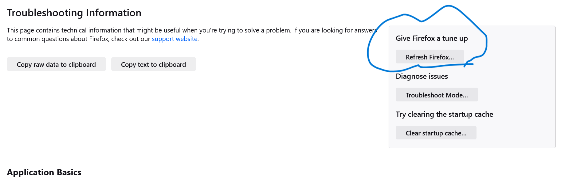 Refresh Firefox Click the menu button (≡). Select Help, then choose More troubleshooting information. Click the Refresh Firefox… button on the right side of the page. In the confirmation window that appears, click Refresh Firefox. Firefox will close and restart. When it finishes, a window will show the data that was imported. Click Finish. Choose whether to restore your previous windows and tabs, then click Let’s go!.
