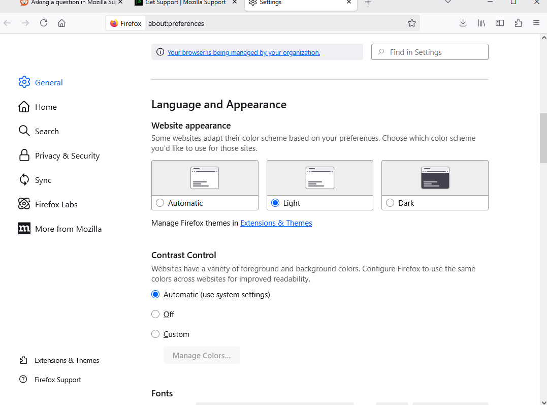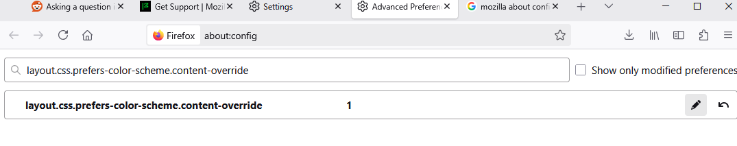I went into Firefox settings and have it set to Light Mode and I turn off Dark Mode. I went into the setting and turn off and on Graphic Acceleration to see if that does anything. I even went into the About:Config and selected 1 (which is force light mode).
