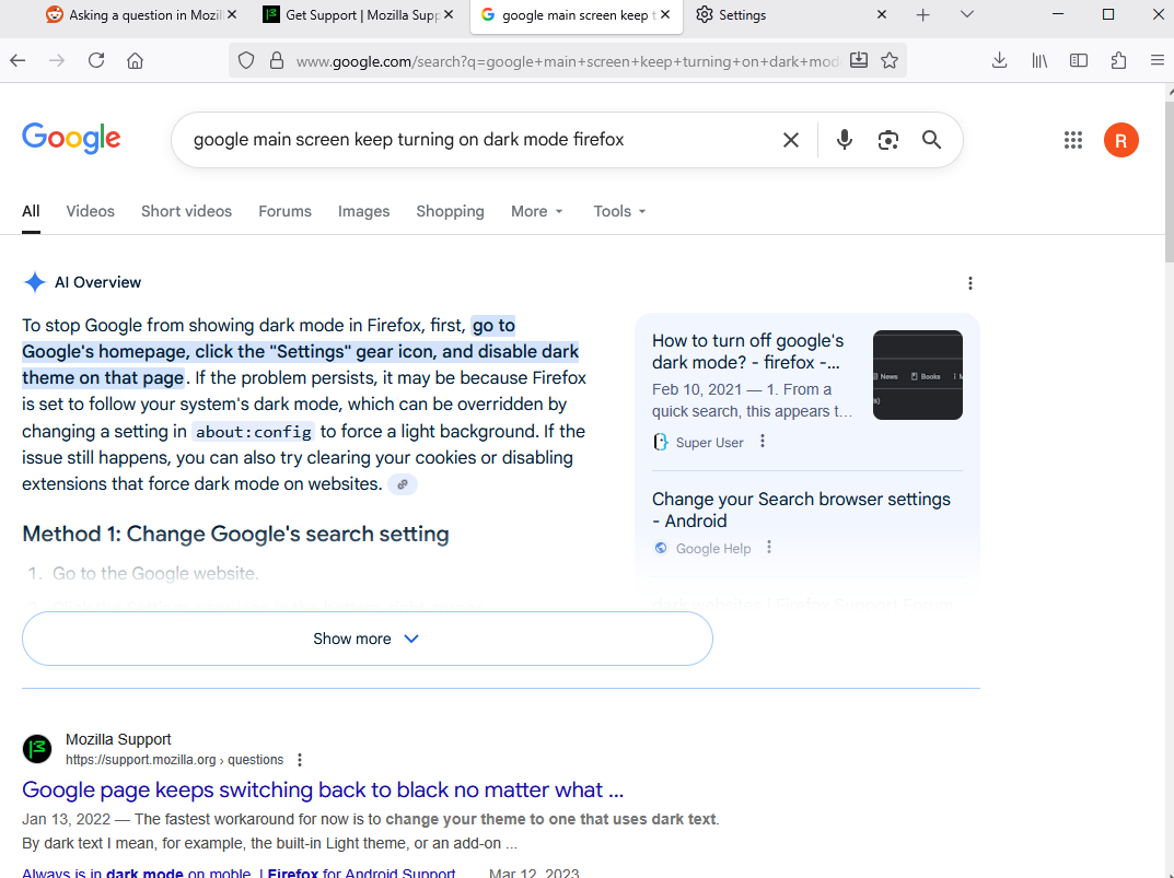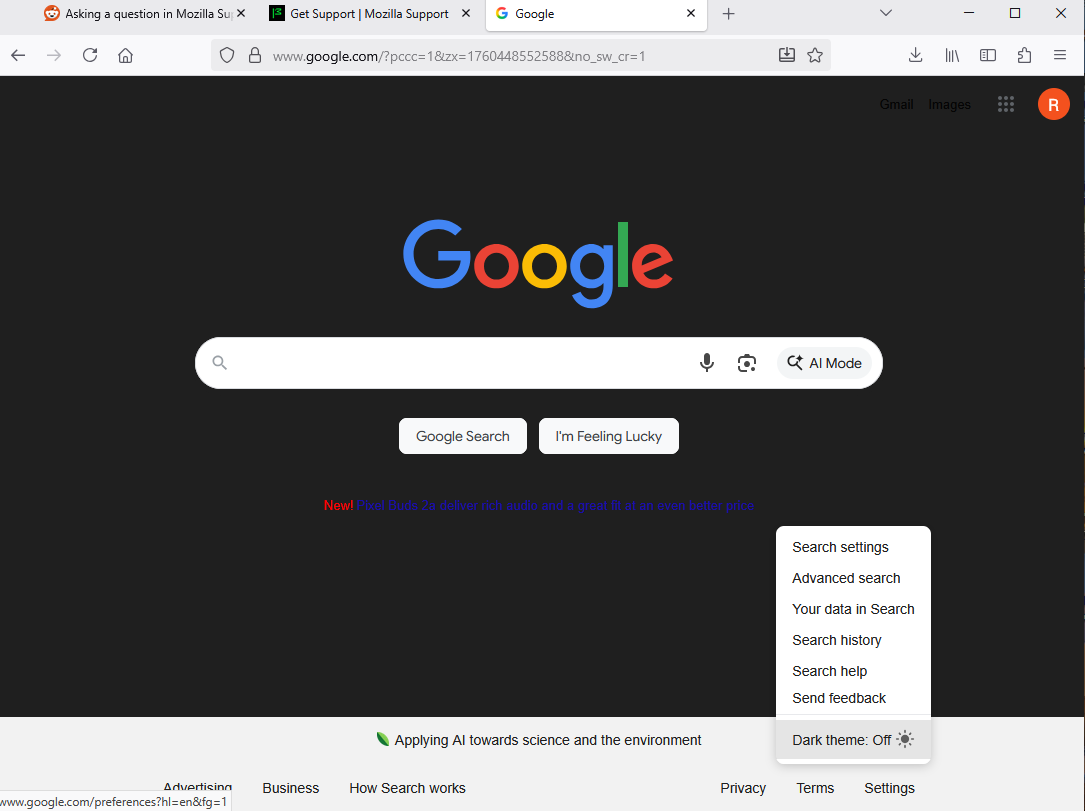 I came across an issue that been bothering me and I am hoping somebody can help me with it, or at least give me viable options on how to resolve it. Recently on October 13, 2025 I open up my Firefox browser like I always have. But this time in particular my main Google search screen that have as my default is automatically set to dark mode. I did not make this change, I did not wanted this change, and I want to be able to resolve this issue.