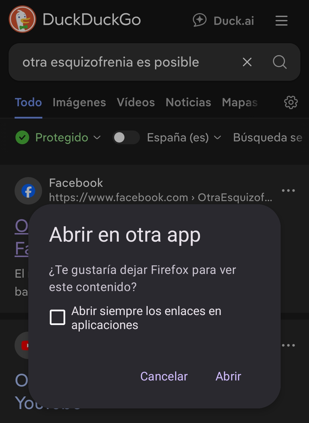 Tengo configurado tanto en Android como en Firefox NO abrir enlaces en aplicaciones, sin embargo, al hacer clic en algún enlace de Facebook me aparece el diálogo "¿Te gustaría dejar Firefox para ver este contenido?". También tengo inhabilitadas y cerradas con firewall no root las apps de Meta en mi Android. Otra peculiaridad es que a veces aparece el diálogo y a veces no.