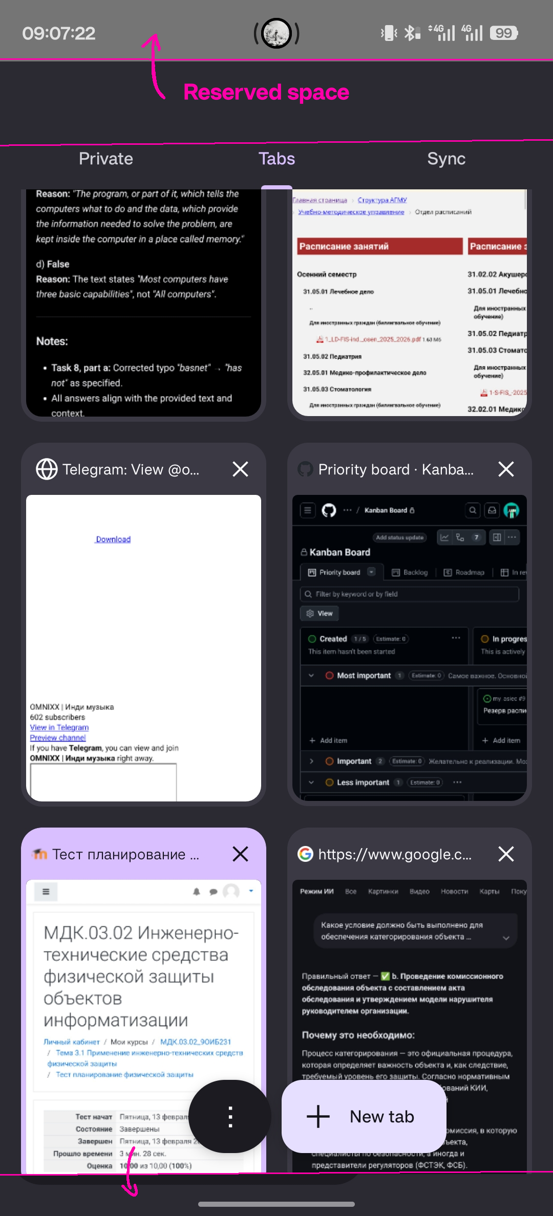 In a recent Firefox update, UI was updated to reflect Material Design. However, some elements aren't displaying as intended. However, the screen with tabs is not displayed on the entire screen (that is, it does not extend into safe zones), although the indents on the screen allow this to be done.