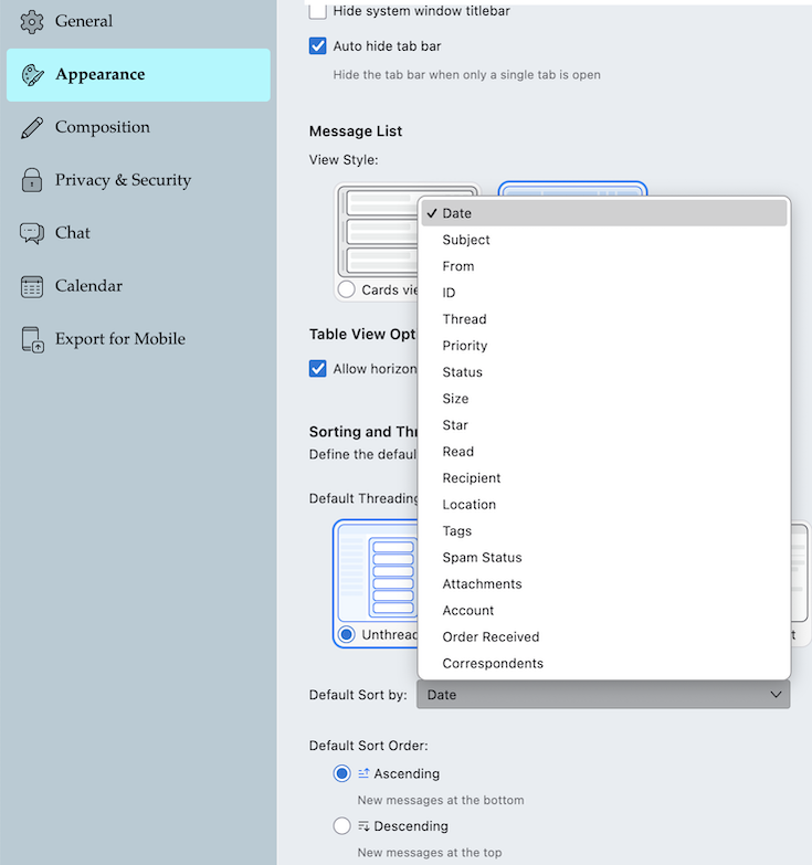 If you want to display your messages sorted by date in the thread pane you'll have to click on the Date column header. BTW if you hadn't noticed before: the "active" column is discernable by a ∨ or ∧ symbol in the column header cell. In my screen shot the active column is also discernable by the additionally light blue background colour of thecolumn header cell.
