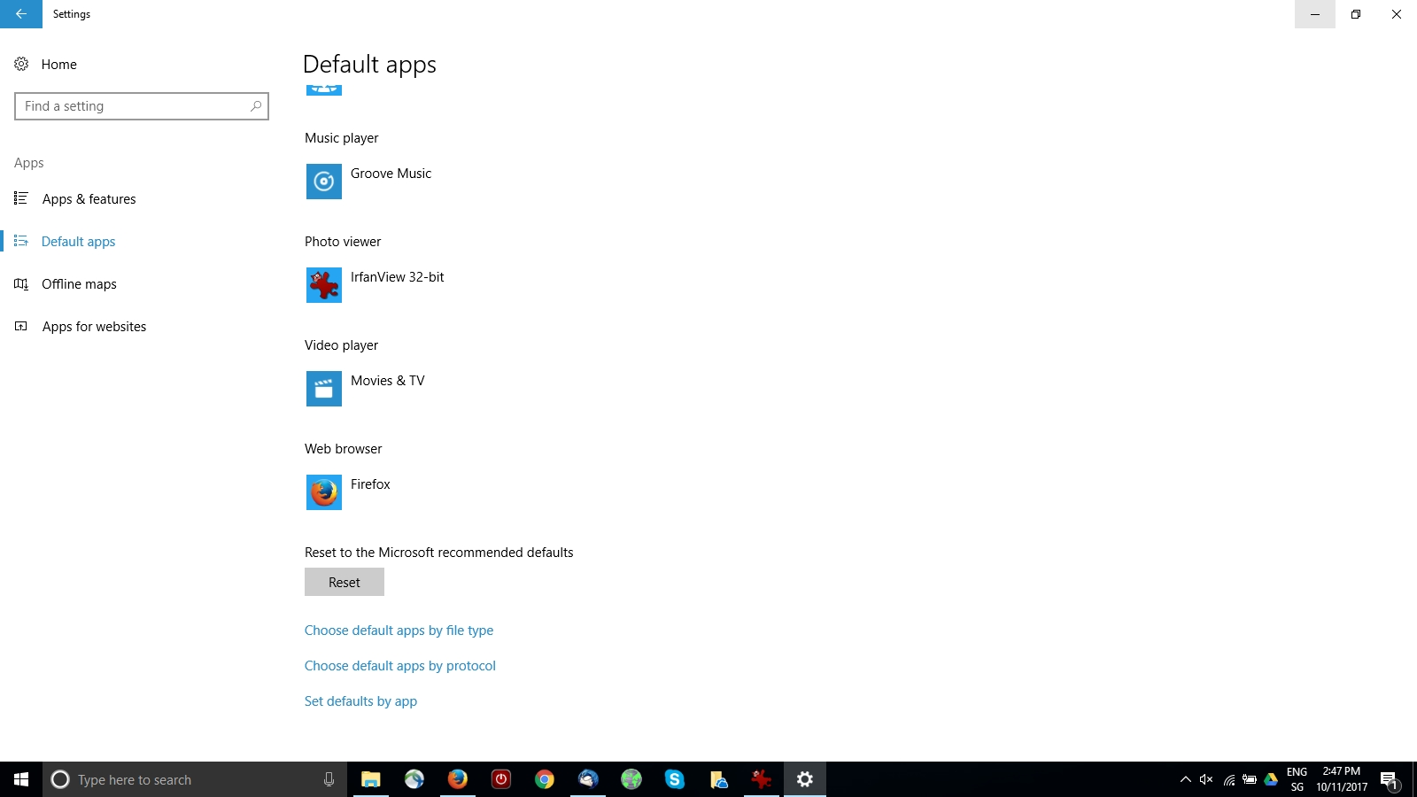 a) Hit the Start button and type "default" (without quotes). Click on Default app Settings.