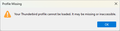 Fourth, I renamed my Profiles folder as you suggested. Far from creating a new Profiles directory, Thunderbird instead threw an error: "Your Thunderbird profile cannot be loaded. It may be missing or inaccessible" with an OK button (see attached screenshot). Clicking that caused the message to go away. Thunderbird didn't create a new Profiles directory and it didn't open at all.