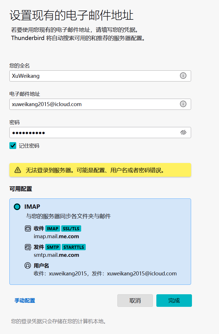 please let me know how I can login in Thunderbird email with my username (xuweikang2015@icloud.com)and password.