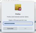A mensagem na janela diz "Firefox está tentando assinar dados. Digite o PIN para permitir isso." O PIN que você está inserindo pode estar incorreto. Certifique-se de que: