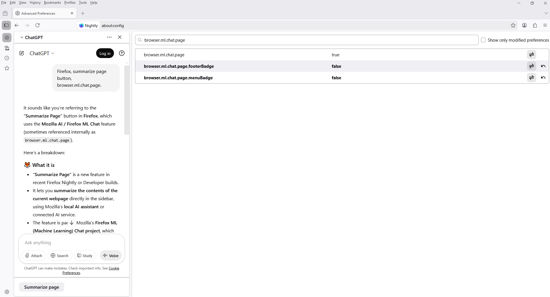 You can try, if you wish. 1 - Go to configuration editor for Firefox https://support.mozilla.org/en-US/kb/about-config-editor-firefox 2 - Enter a search term browser.ml.chat.page You can double-click on the preference to set the value to false
