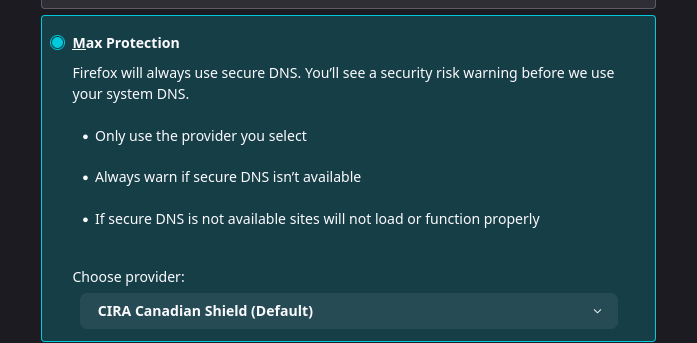 Using firefox 148, when I select the "CIRA Canadian shield" DNS over HTTPS option it does not work. If I select the other 2 options Cloudflare or NextDNS those options work.