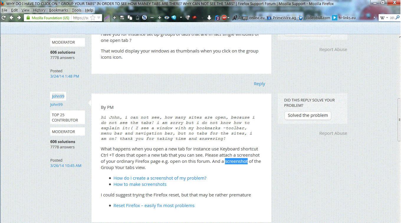 hi, this a screenshot of my fire fox, i have 3 sites open, but i do not see them, unless i press the "group your tabs" button!
