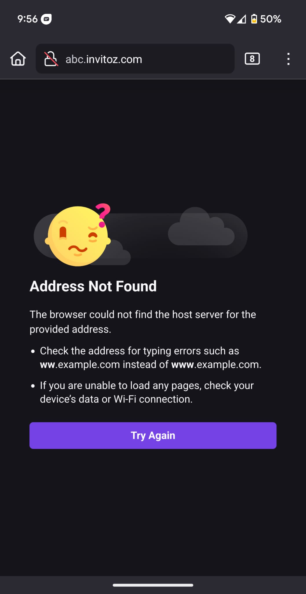 DNS configuration • Verified wildcard DNS per Firebase instructions (CNAME *.invitoz.com → ghs.googlehosted.com). • DNS has propagated globally (>24h). • dig abc.invitoz.com returns correct CNAME/A records from desktop & Chrome Android. • On Android Firefox, resolution fails (browser shows NXDOMAIN).