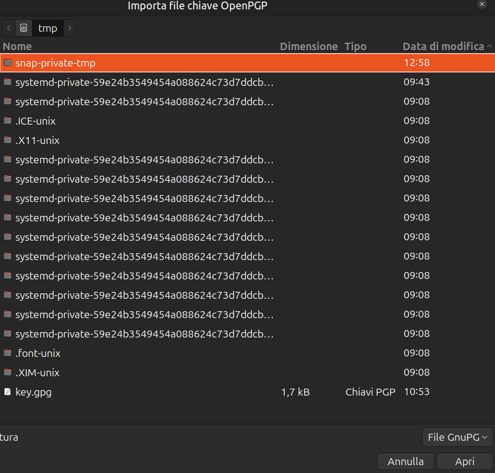 -> gestiore chiavi gpg -> file -> importa chiavi publiche da file -> apro la directory /tmp -> apro il file key.gpg