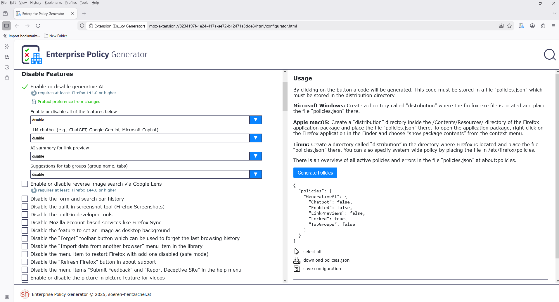 If you wish to study Enterprise Policy Generator. https://addons.mozilla.org/firefox/addon/enterprise-policy-generator