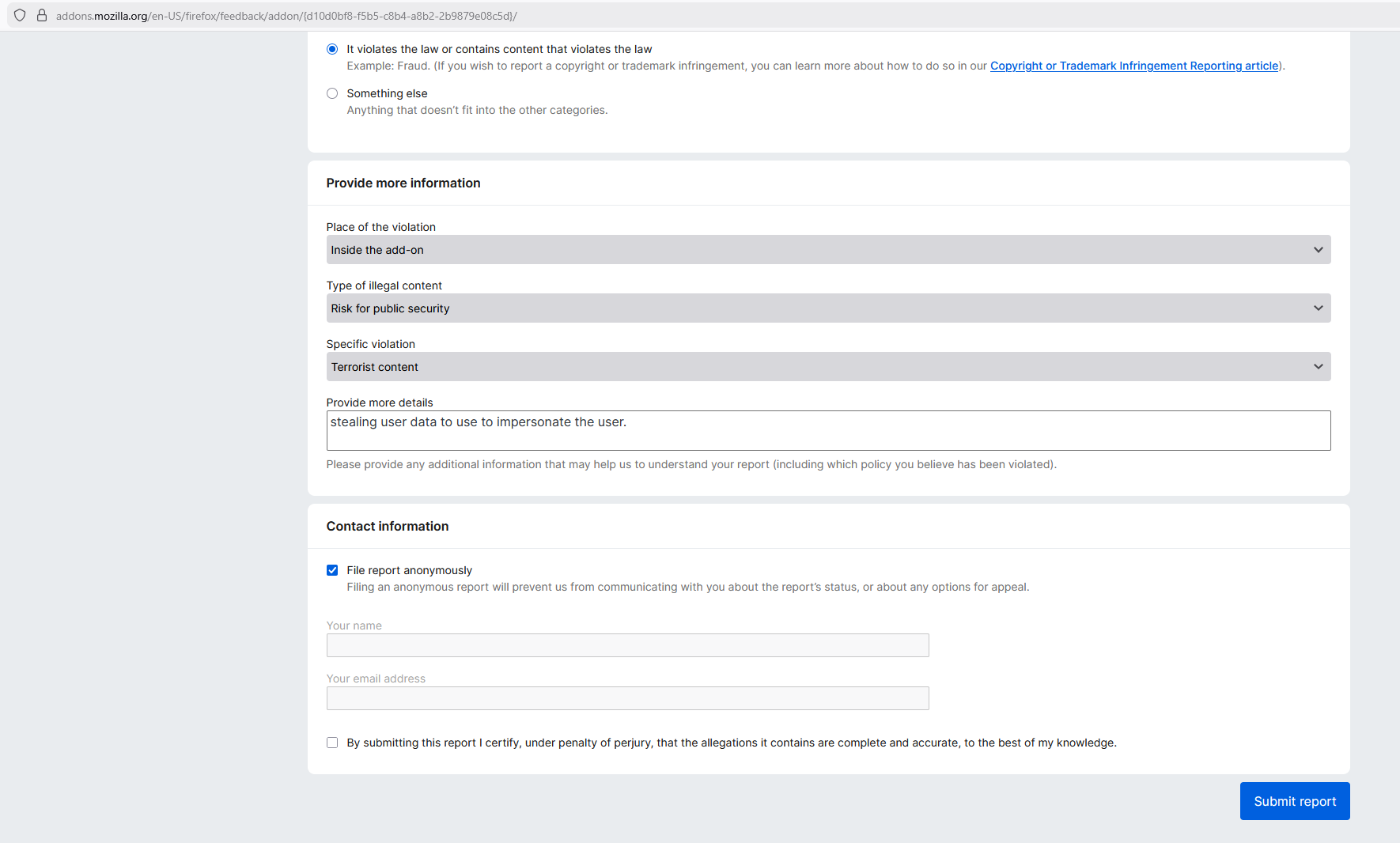 i want to know why firefox extension reporting requires the user to check a box near text that says that the user is telling the 'complete' and 'accurate' truth. that's impossible for a human. it's also cruel and unusual. why does mozilla apparently assume that every user is a judge and a lawyer in the united states who is also God? it doesnt make any sense. DO NOT REPLY TO THIS MESSAGE.