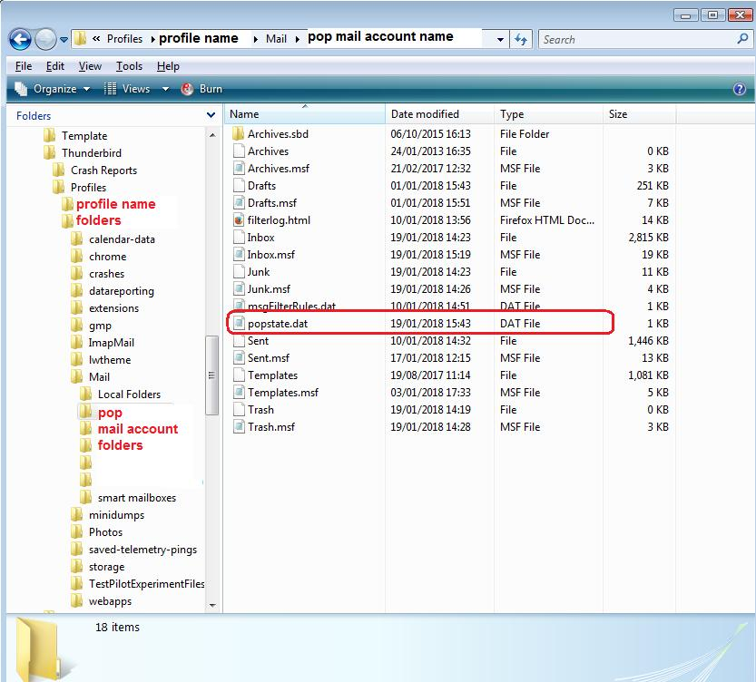 the pop mail account name folder should contain the 'popstate.dat' file. I've added an image showing an example of pop account. Do you see other popstate.dat files maybe with a number ?