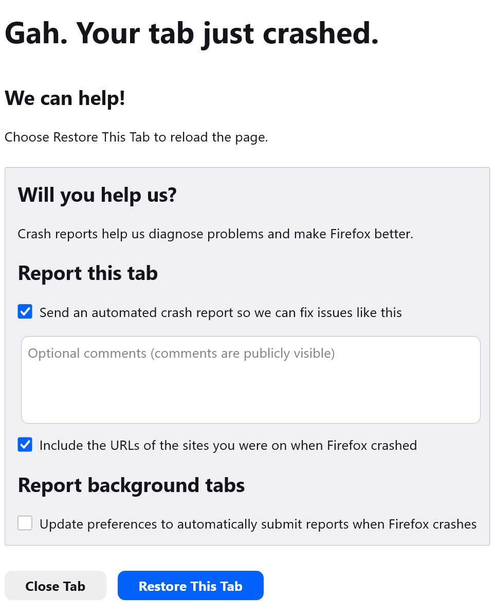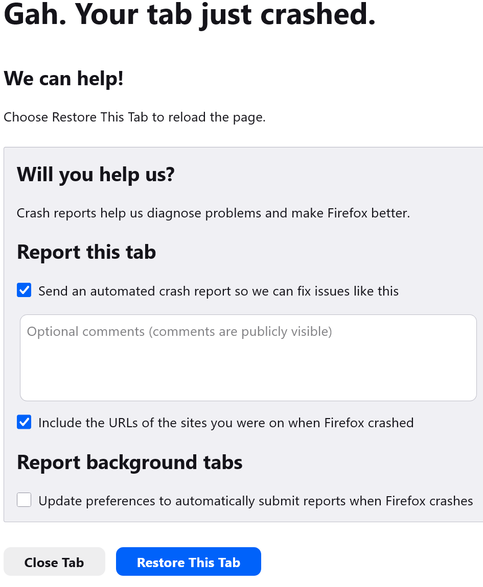Gmail tab crash just now. It just happened now with another website tab crash. i'm reverting back to 147.01