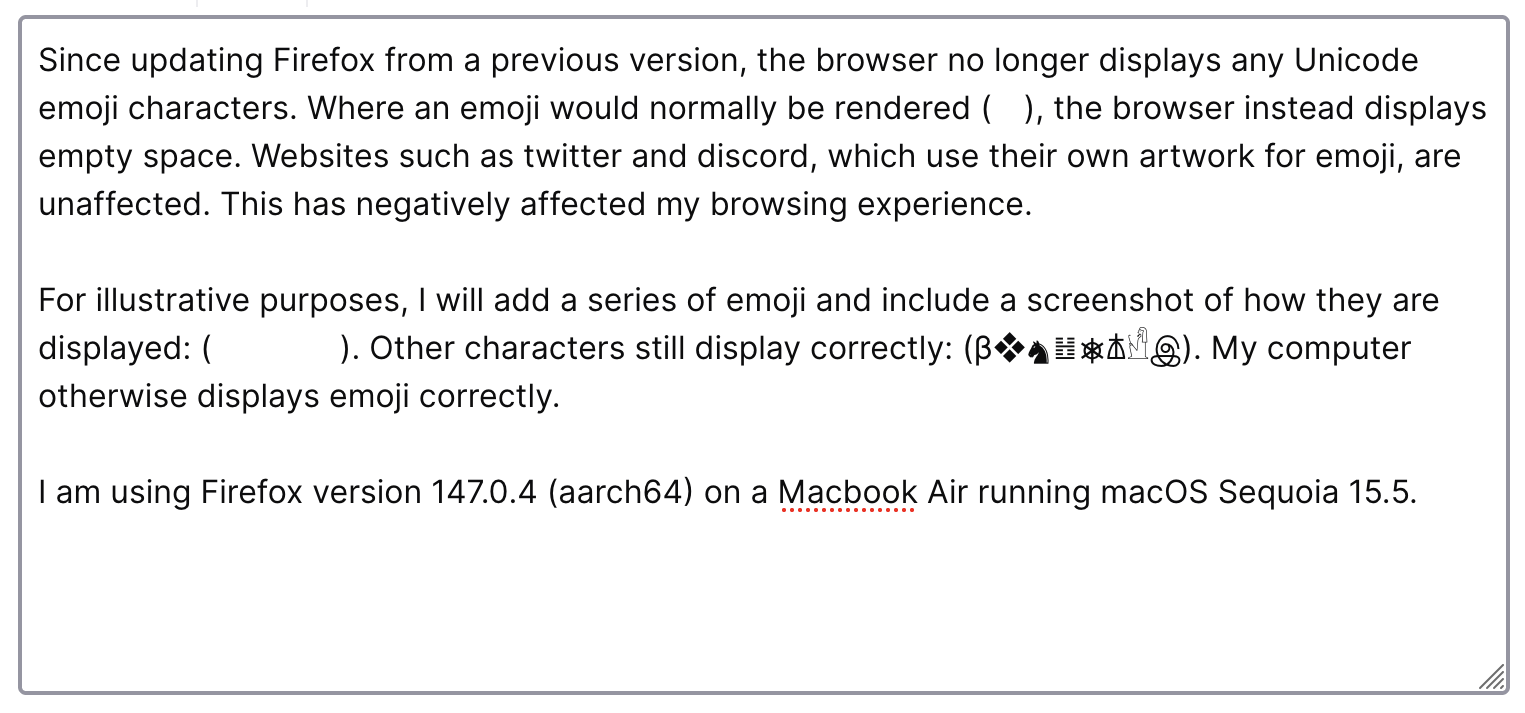 For illustrative purposes, I will add a series of emoji and include a screenshot of how they are displayed: (😀🙁😡💀). Other characters still display correctly: (β❖♞䷲⎈𐘢𓀺இ). My computer otherwise displays emoji correctly. The issue persists after disabling extensions, and has persisted between computer restarts.